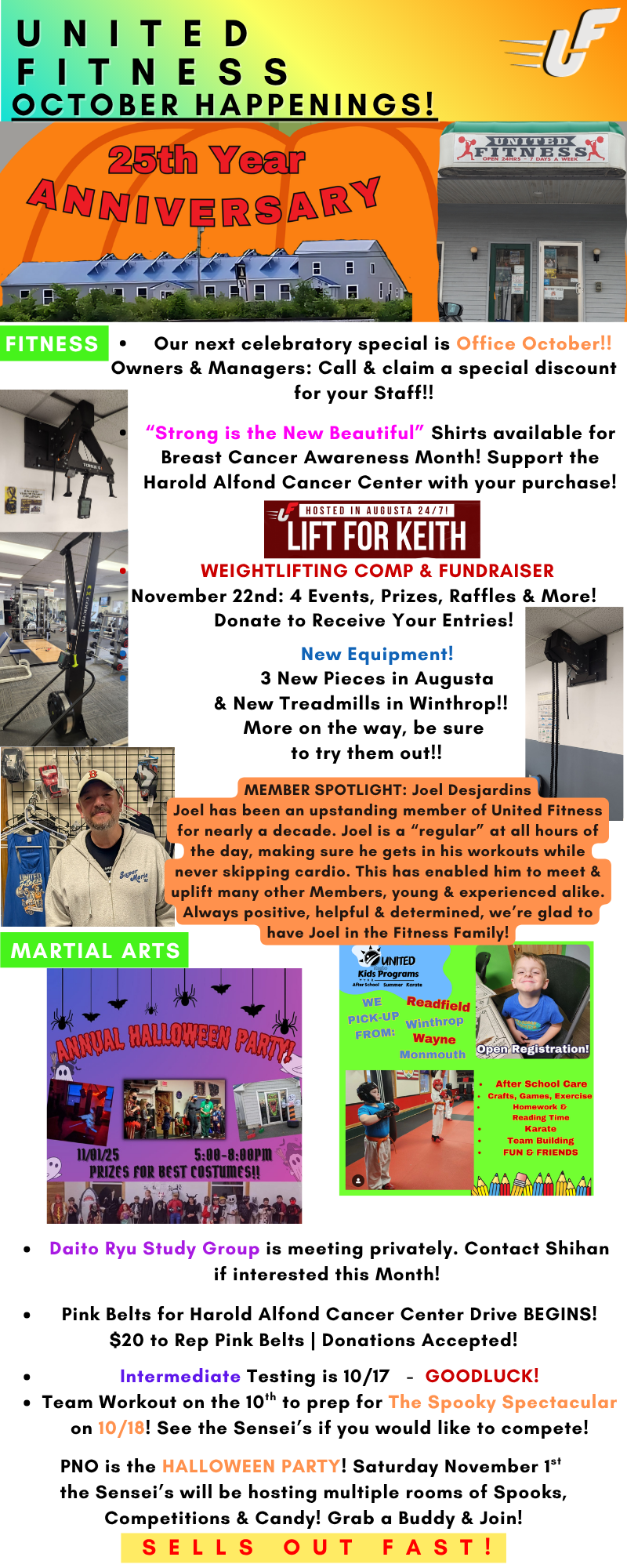 United Fitness LLC opened in Winthrop in 1998. Made for everyone ages 3 & up, the facilities are designed for those of all fitness & athletic levels. We strive to assist all ages gain the strength and confidence to get fit, enjoy their training, and have a great attitude to accomplish their goals. No matter what your interest or goal may be, we have a variety of ways to help you reach them!